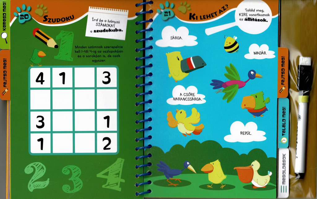 A 50 játékos feladvány – Állatok azoknak a gyerekeknek szól, akik rajonganak az állatvilágért, és szívesen próbálják ki magukat különféle, rövid idő alatt megoldható kihívásokban. A kötetben 50 változatos rejtvény vár: köztük olyan típusok, amelyek a szókinccsel, logikával, térbeli tájékozódással és figyelemösszpontosítással dolgoztatnak, illetve vannak látásélességet és mintafelismerést igénylő feladatok is. A fókusz minden oldalon az állatokon van – a gyerekek a játék során találkoznak különféle élőhelyekkel és viselkedési formákkal, miközben észrevétlenül rendszerezik a tudásukat: mi mivel függ össze, mi hova illik, mi alapján érdemes csoportosítani.