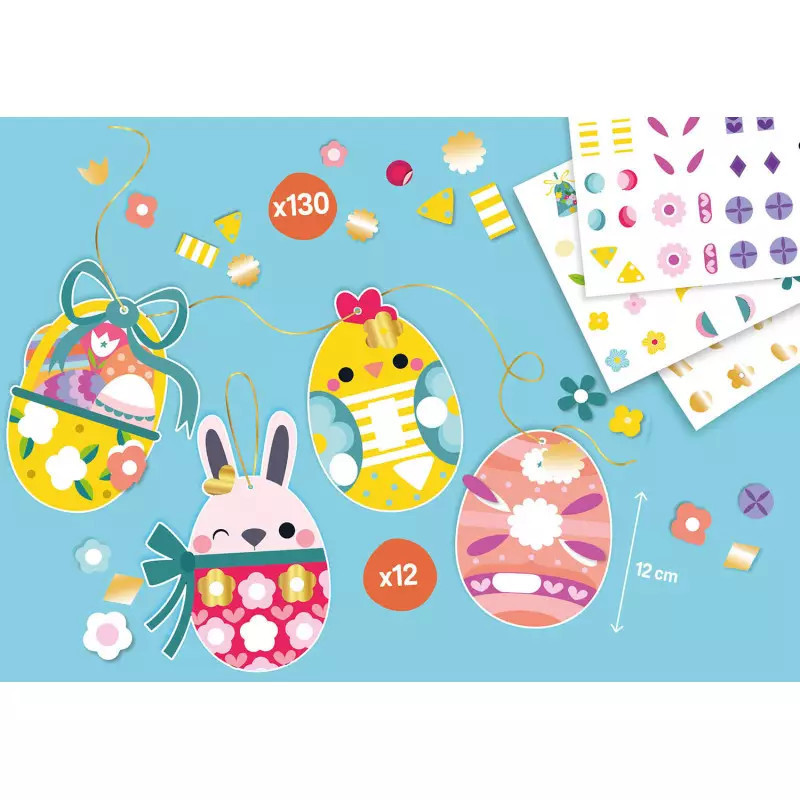 Az Auzou húsvéti papírtojás dekoráció készlet 12 különböző tojásformát tartalmaz, amelyeket a gyerekek arany színű matricákkal díszíthetnek fel. Az elkészült alkotásokat egy hosszú, látványos füzérré lehet összeállítani.