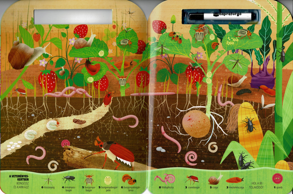 A játékos keresgélés észrevétlenül fejleszti a megfigyelőképességet, a vizuális észlelést és a koncentrációt. A célzott karikázás gyakorlása közben fejlődik a finommotorika és a kéz-szem koordináció, miközben a gyerekek tanulják a rendszerezést és az osztályozást: mi szárnyas, mi mászik, ki él a talajban, ki a leveleken, ki szereti a fényt vagy épp a sötét zugokat. A kötet segítségével a gyerekek nemcsak a rovarok sokszínű világával, hanem a bogarak izgalmas élőhelyeivel is megismerkednek.
