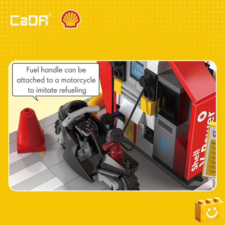 A CaDA® Shell önkiszolgáló benzinkút egy hivatalos licenc alapján készült, statikus építmény, amely 305 elemből építhető meg. A modell modern kialakításával és jól felismerhető Shell arculatával hiteles környezetet teremt városépítős játékokhoz és kiállítási jelenetekhez.