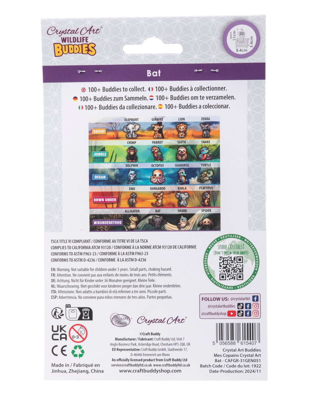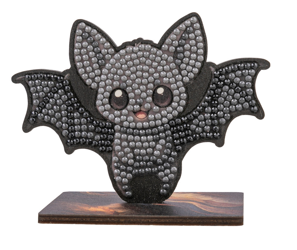 Készíts saját, csillogó denevérfigurát! A Crystal Art® gyémántszemes kirakó – Denevér csillogó kövekkel kirakható, fa talppal kiállítható dekorációt ad.