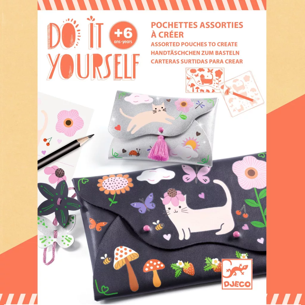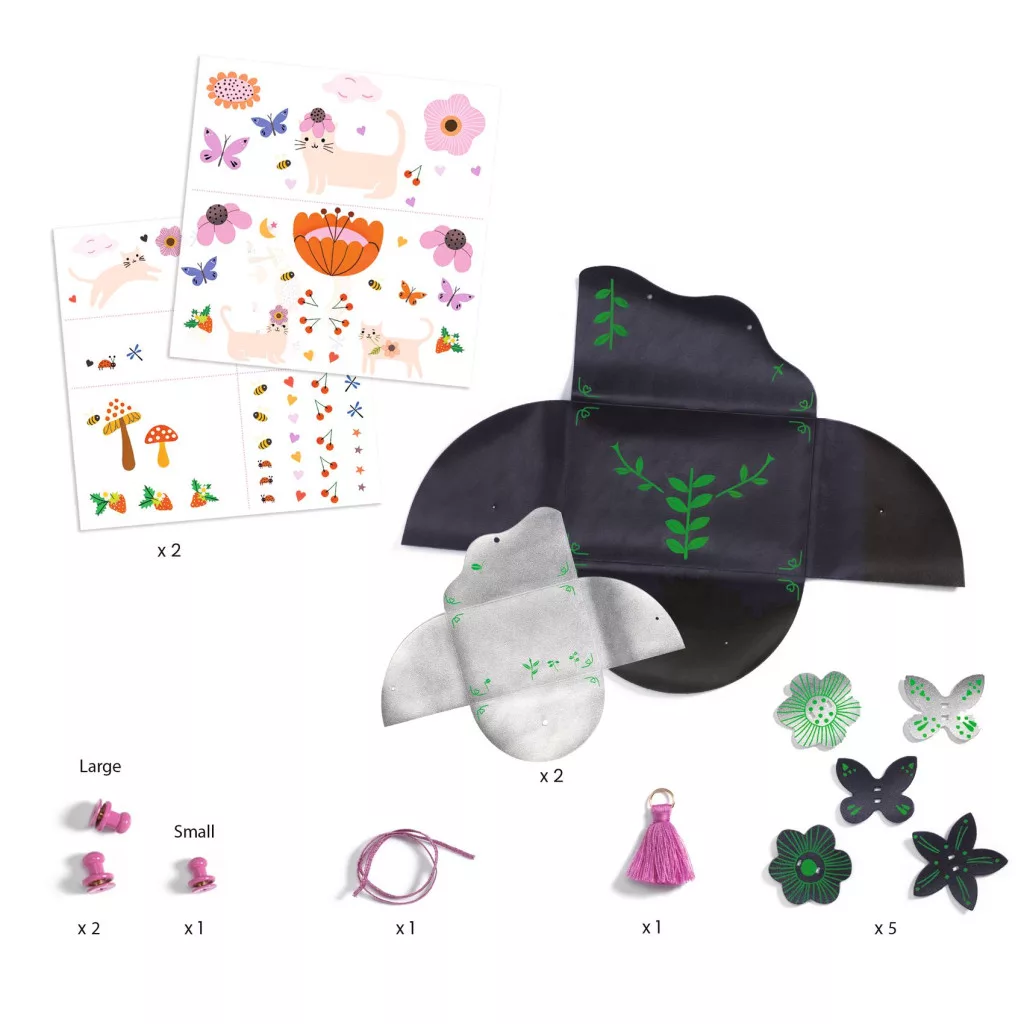 A gyermek satírozó matricázás technikával felviszi a kiválasztott díszítéseket a kiszabott műbőr lapra, majd a készletben található csavaros kapcsokkal összekapcsolja. Hozzáadja a pompont, a csuklópántot és a csinos műbőr dekorációkat. Micsoda büszkeség, hogy használhatja új divatos kiegészítőit!