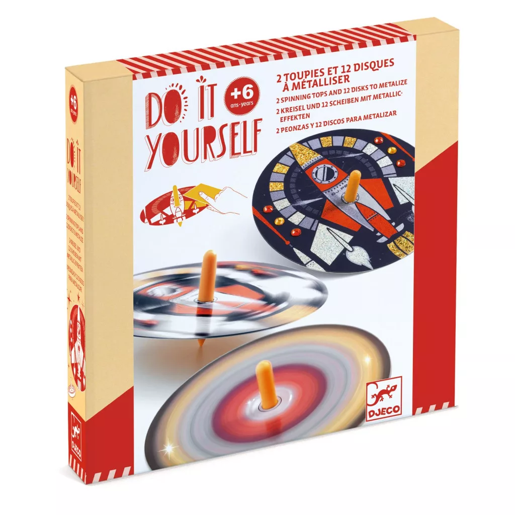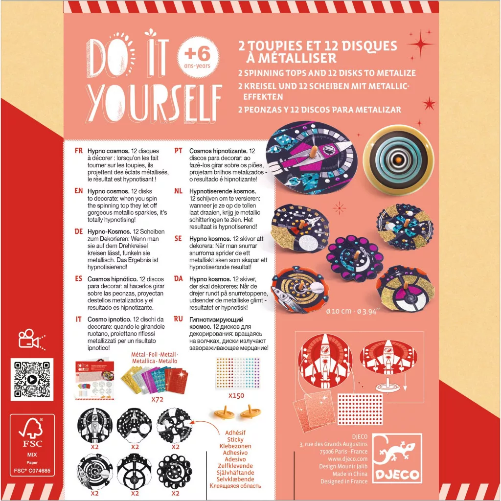 Egy DIY pörgettyű készítő kreatív készlet, melyben 2 pörgettyűalaphoz készíthető 12 db saját díszítésű űrhajós feltét. A világűr témájú korongokon található színkódok és a füzet segítségével lehet beazonosítani és "felragasztani" az adott színű fémfóliát a megfelelő helyre. A csillogó fémes fólia mintegy varázsütésre felöltözteti a kívánt felületet. Ezután már csak az utolsó simítás van hátra: jöhetnek a tündöklő "drágakő" matricák! Miután elkészültek a fémesen csillogó űrhajós korongok, válasszuk ki az egyiket, helyezzük az alapra és pörgessük meg: a fémes színkeverés csodája kápráztat el kicsiket és nagyobbakat!
