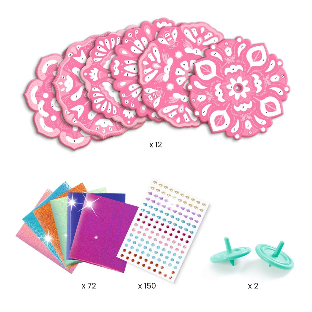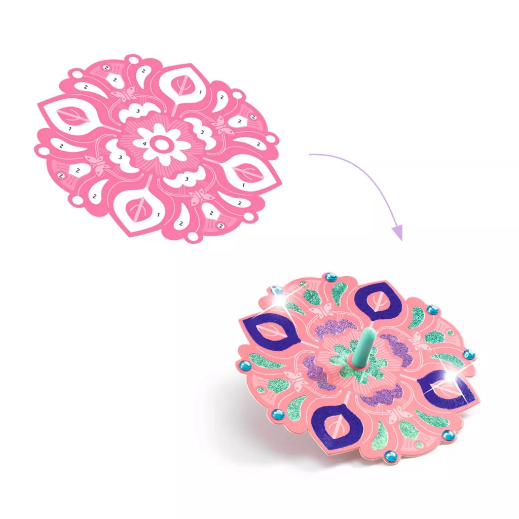 Egy DIY pörgettyű készítő kreatív készlet, melyben 2 pörgettyűalaphoz készíthető 12 db saját díszítésű virágos feltét. A virág alakú korongokon található színkódok és a füzet segítségével lehet beazonosítani és "felragasztani" az adott színű fémfóliát a megfelelő helyre. A csillogó fémes fólia mintegy varázsütésre felöltözteti a kívánt felületet. Ezután már csak az utolsó simítás van hátra: jöhetnek a tündöklő strasszkő matricák! Miután elkészültek a ragyogó virágok, válasszuk ki az egyiket, helyezzük az alapra és pörgessük meg: a csillogó színkeverés csodája kápráztat el kicsiket és nagyobbakat!