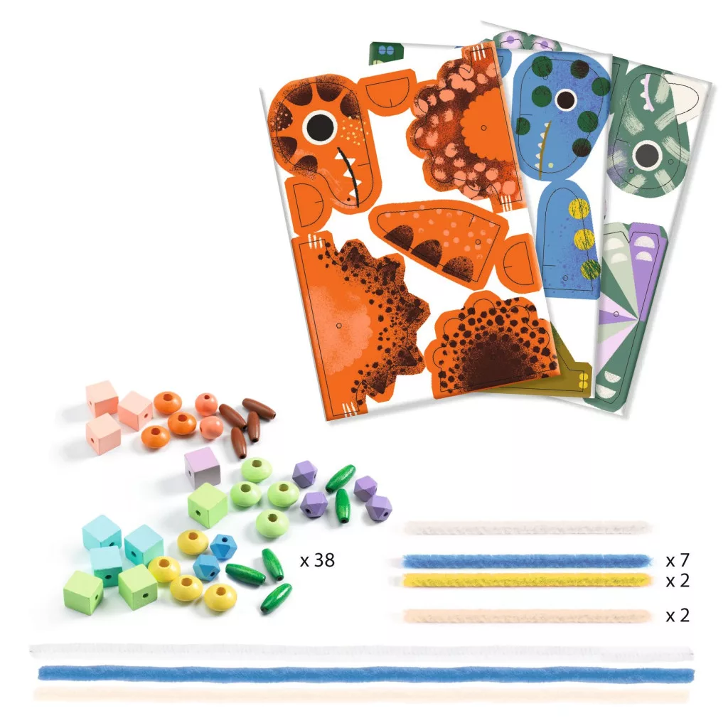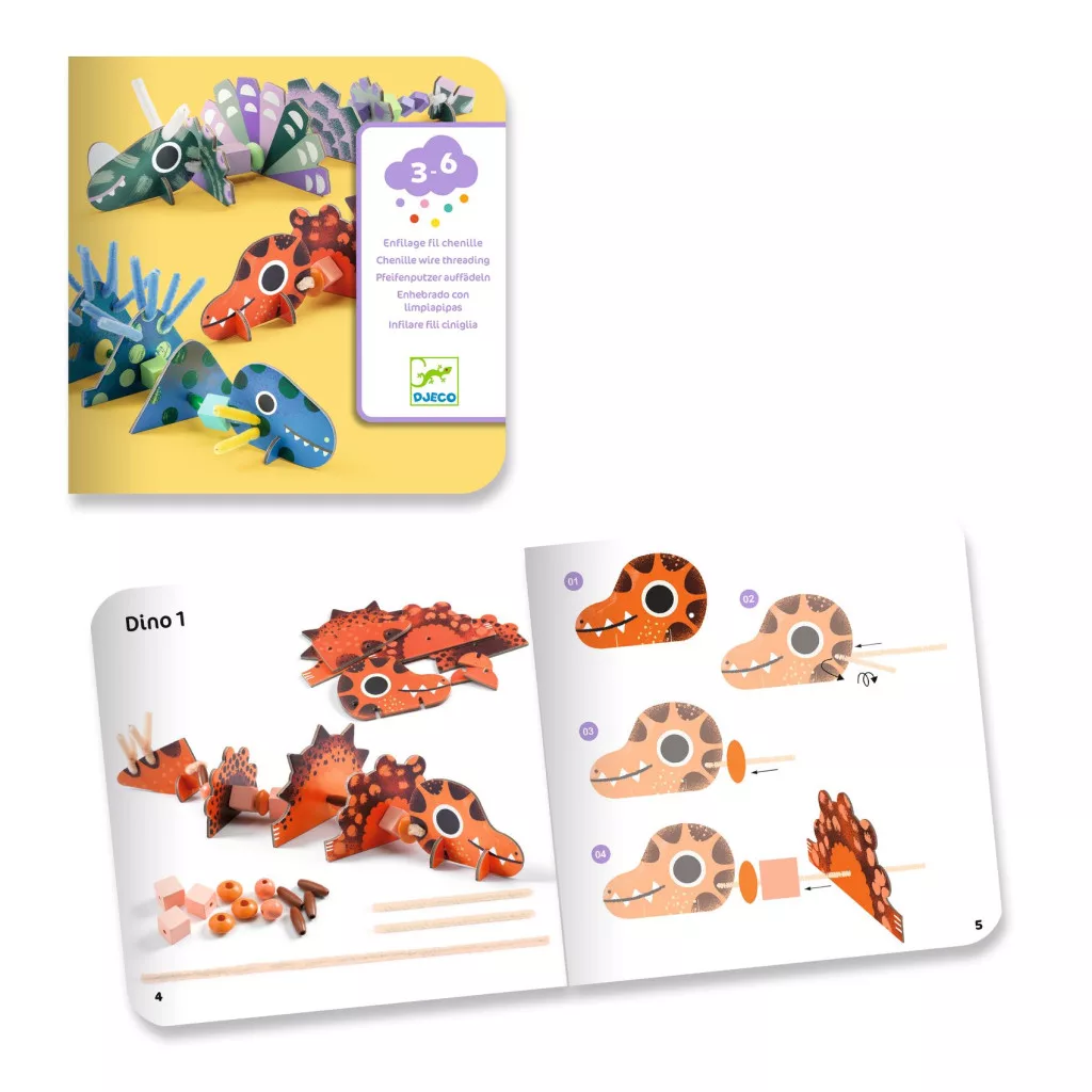 Egy különleges tevékenység, melynek során 3 kedves és egyben félelmetes dinót alkothatnak a gyerekek. A feladat során színes fagyöngyöket és előre kivágott karton elemeket fűznek fel zsenília drótra. A készletből egy lilás, egy kékes és egy narancssárgás színű dinoszaurusz készíthető, természetesen a színek keverhetőek. Az alkotó tevékenység közben fejlődik a kreativitás és a képzelet. A képes magyarázó füzetben találhatsz segítséget.