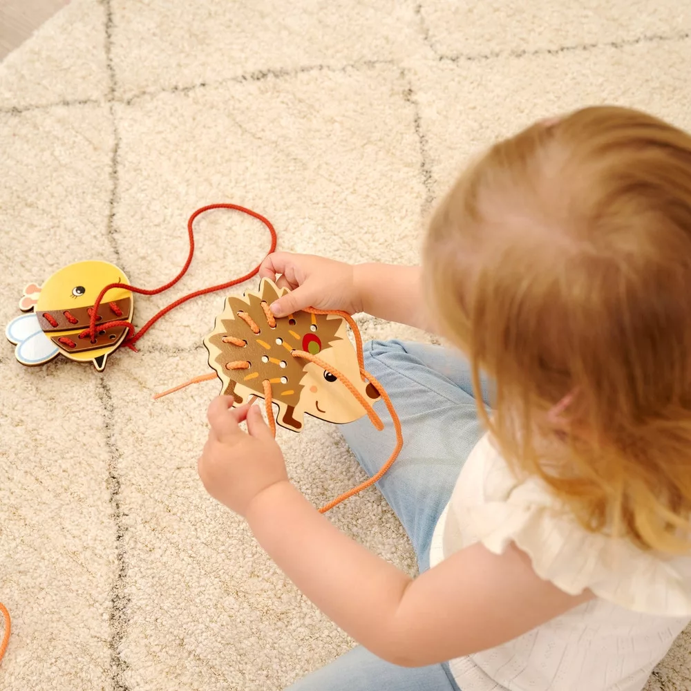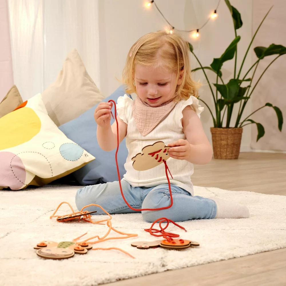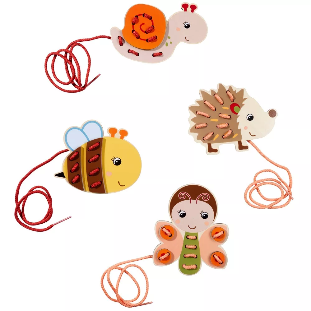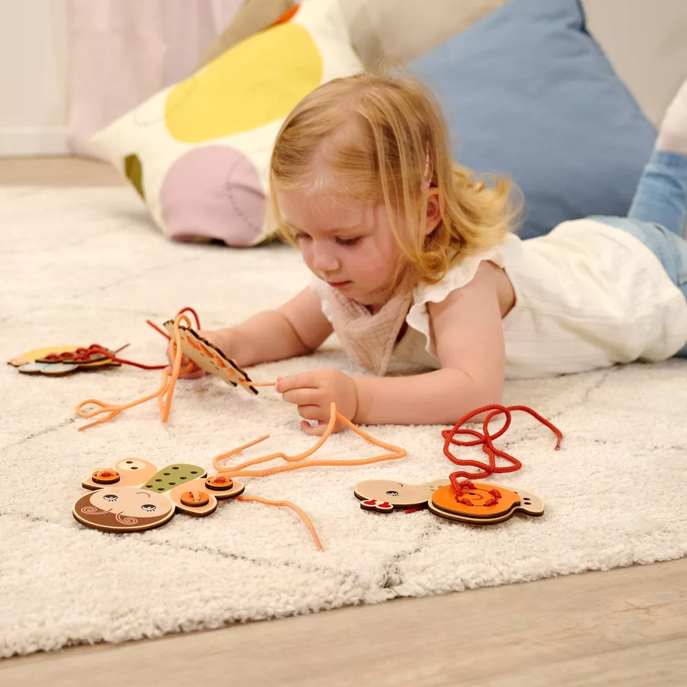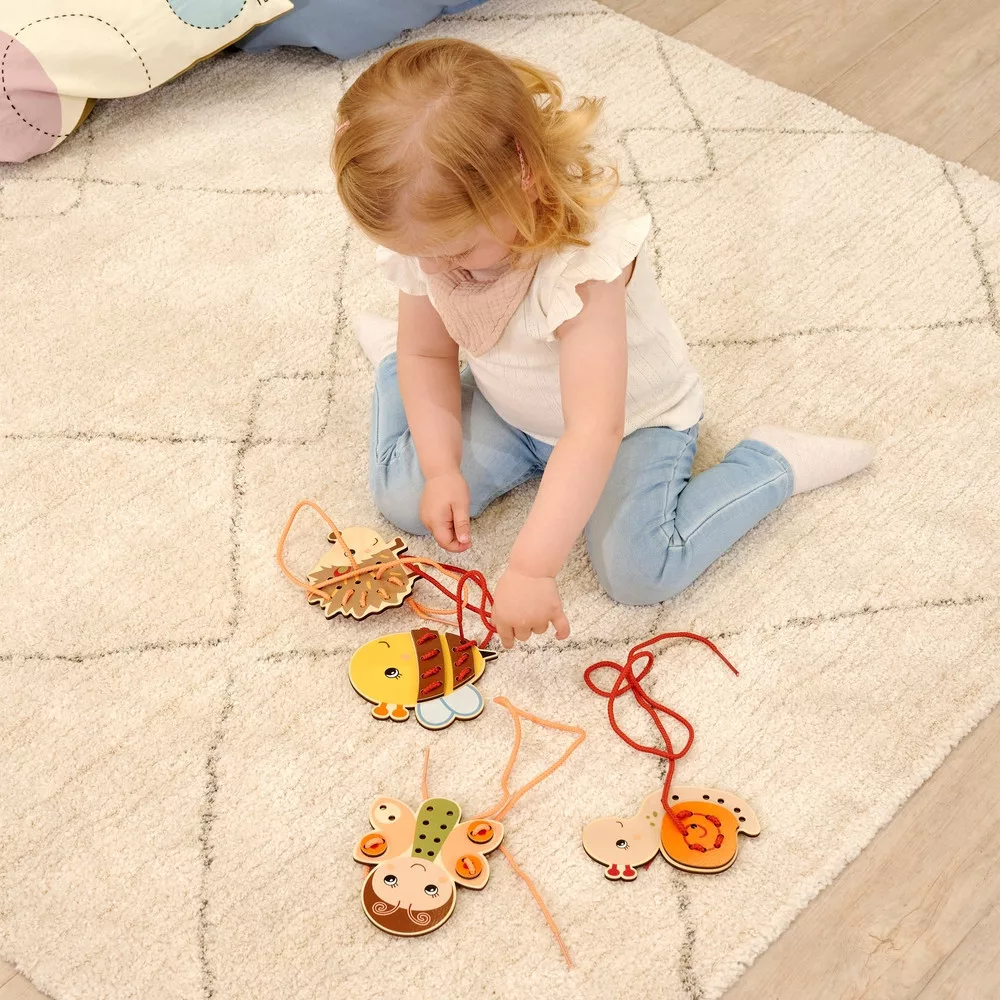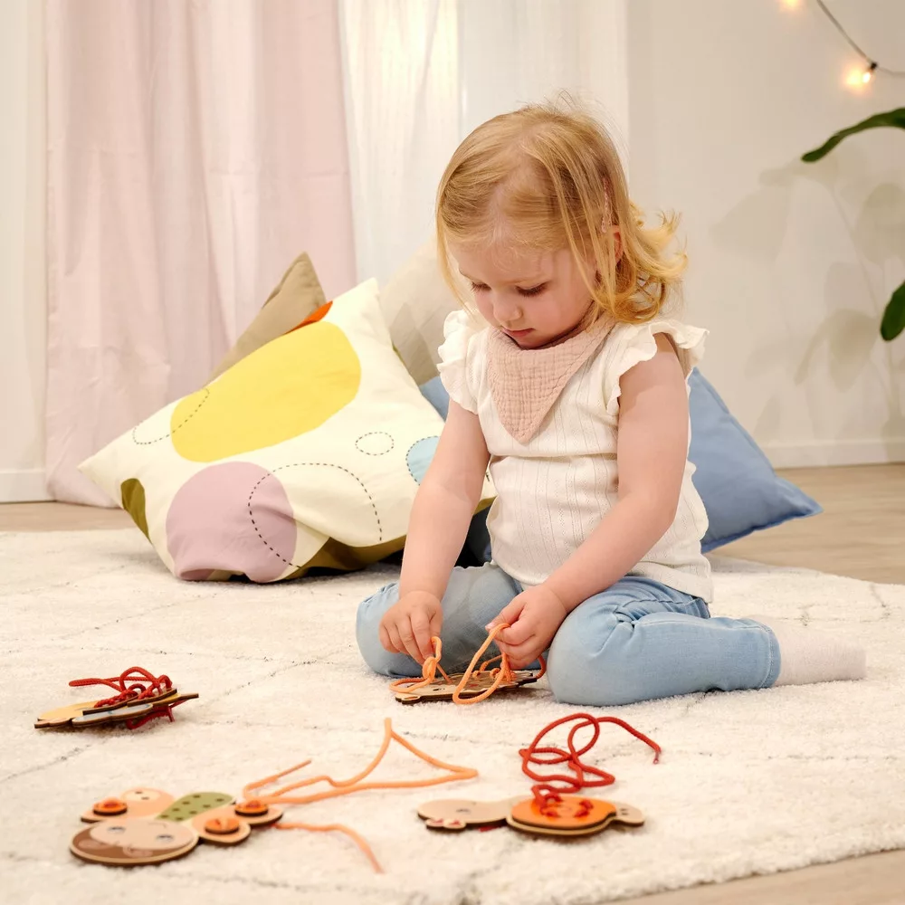 A játék során a gyerekek a zsinórt a lyukakon keresztül vezetve állítják össze az állatfigurákat. Ez a tevékenység kiválóan fejleszti a finommotorikát, a kézügyességet, a szem–kéz koordinációt és a koncentrációt.