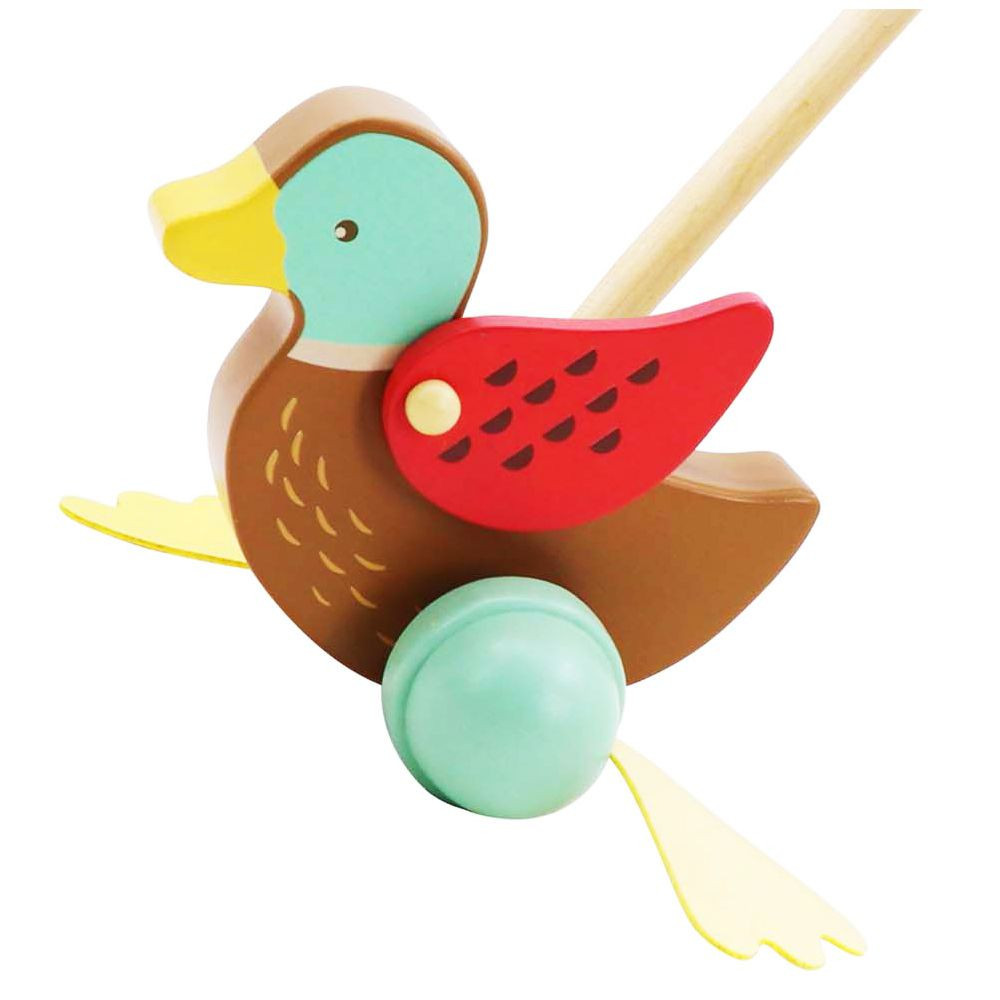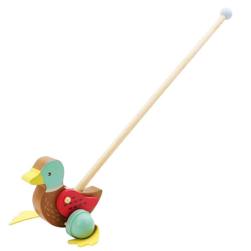 Ez a színes fa tologatós kacsa ideális játék a járni tanuló kisgyermekek számára. A hosszú fogantyú segítségével a kicsik könnyedén maguk előtt tolhatják a játékot, miközben gyakorolják az egyensúlyozást és a stabil járást.