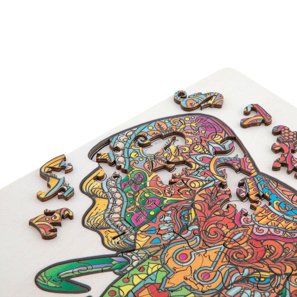 Egyedi formájú fa mozaikdarabokból álló kirakó elefántos dizájnnal. A 132 db elemet összeillesztve tartós, dekoratív képet kapsz, amit a mellékelt fa állványra helyezve ki is állíthatsz.