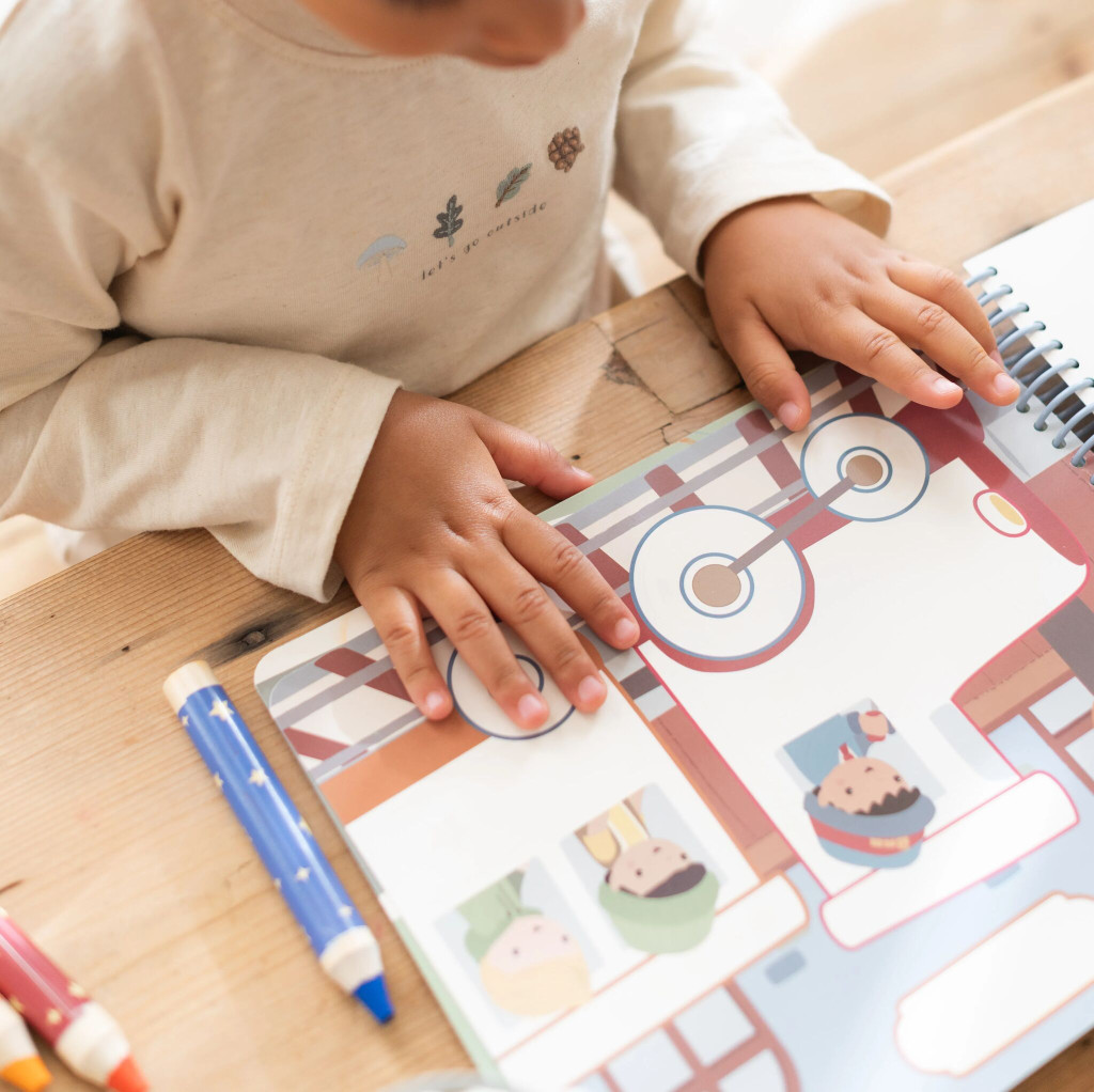 Little Dutch varázsfüzet színes ceruzákkal: 20 vidám színezőlap, 10 üres oldal és 3 puha ceruza a végtelen járműves alkotáshoz már 2 éves kortól.