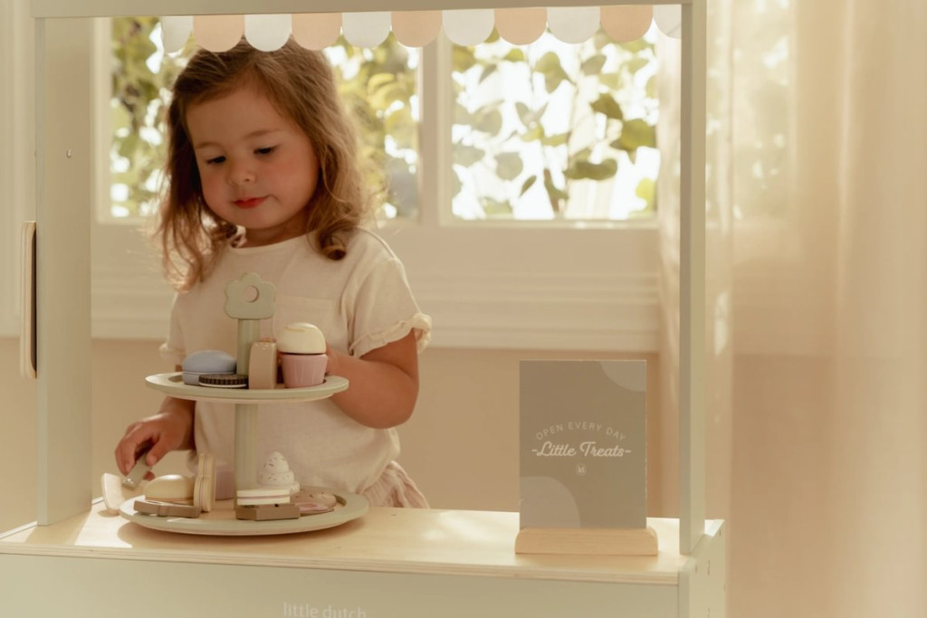 Little Dutch emeletes sütemény kínáló: három szint csábító falatokkal (muffin, keksz, makaron), hozzá tortalapát és illusztrált menükártya – szerepjátékhoz, vendégváráshoz, baráti „teapartikhoz”.