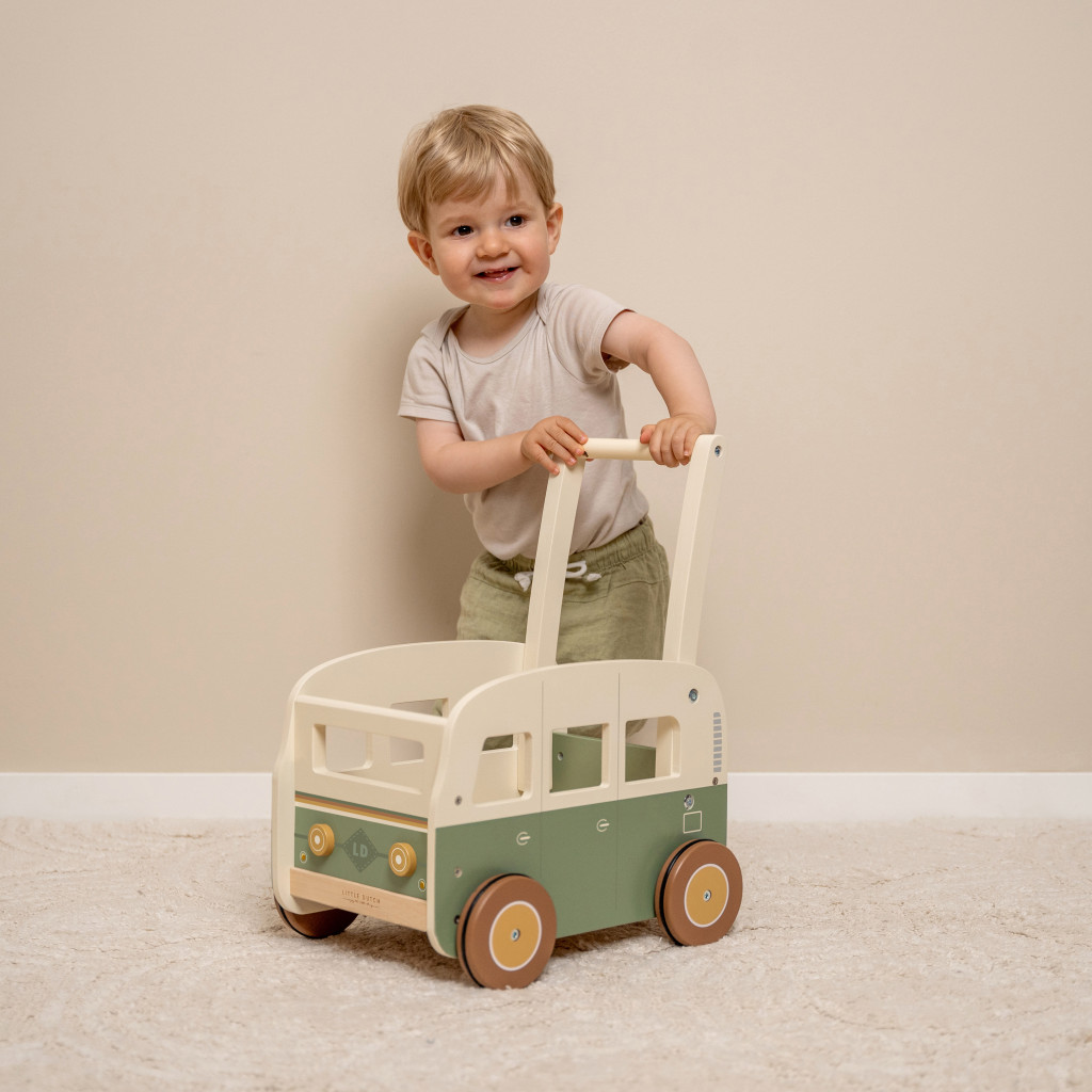 Kalandozz a lakásban ezzel a klasszikus szörfös furgon által ihletett, vintage stílusú járássegítővel. Indítsd „be” a motort, ragadd meg a stabil tolórudat, és vezesd a saját kis lakóautódat!