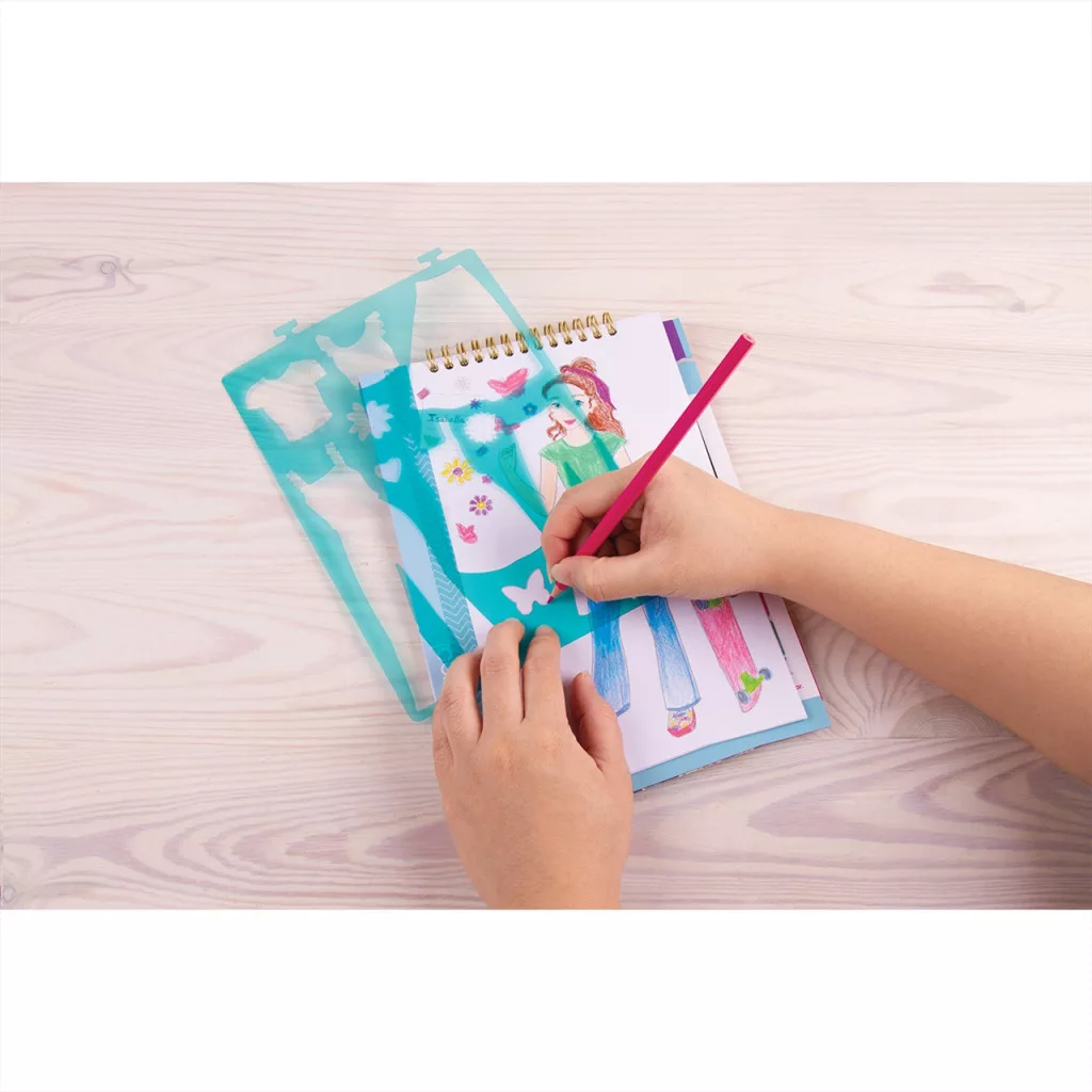A készletben található előrajzolt oldalak és sablonok megkönnyítik a tervezést, így a gyerekek könnyedén alkothatnak saját ruhakollekciókat.