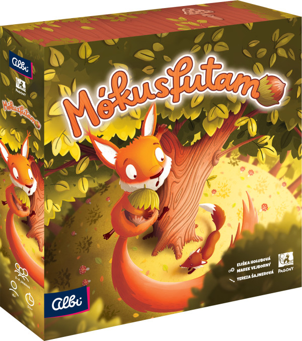 Ebben a látványos társasban egy hatalmas mogyorófán kergetőzünk mókusokként. A feladatunk, hogy elegendő mogyoróval töltsük fel télire az éléskamránkat, emiatt egymás orra elől próbáljuk elhalászni a legnagyobb szemeket. A színes kockákkal dobva minél ügyesebben kell megterveznünk az utunkat, hogy a lehető leggyorsabban érjünk a finom falatokhoz és a rejtekhelyekhez. De sajnos a róka ott ólálkodik a fa körül, a bagoly pedig a lombkoronát tartja szemmel – ők arra várnak, hogy ránk ijesszenek, és visszakergessenek bennünket a fa tetejére. Ilyenkor ijedtünkben az épp megszerzett mogyorót is elejtjük, és kereshetünk újabbat! Vajon kinek sikerül elsőként minden rejtekhelyet megtölteni?