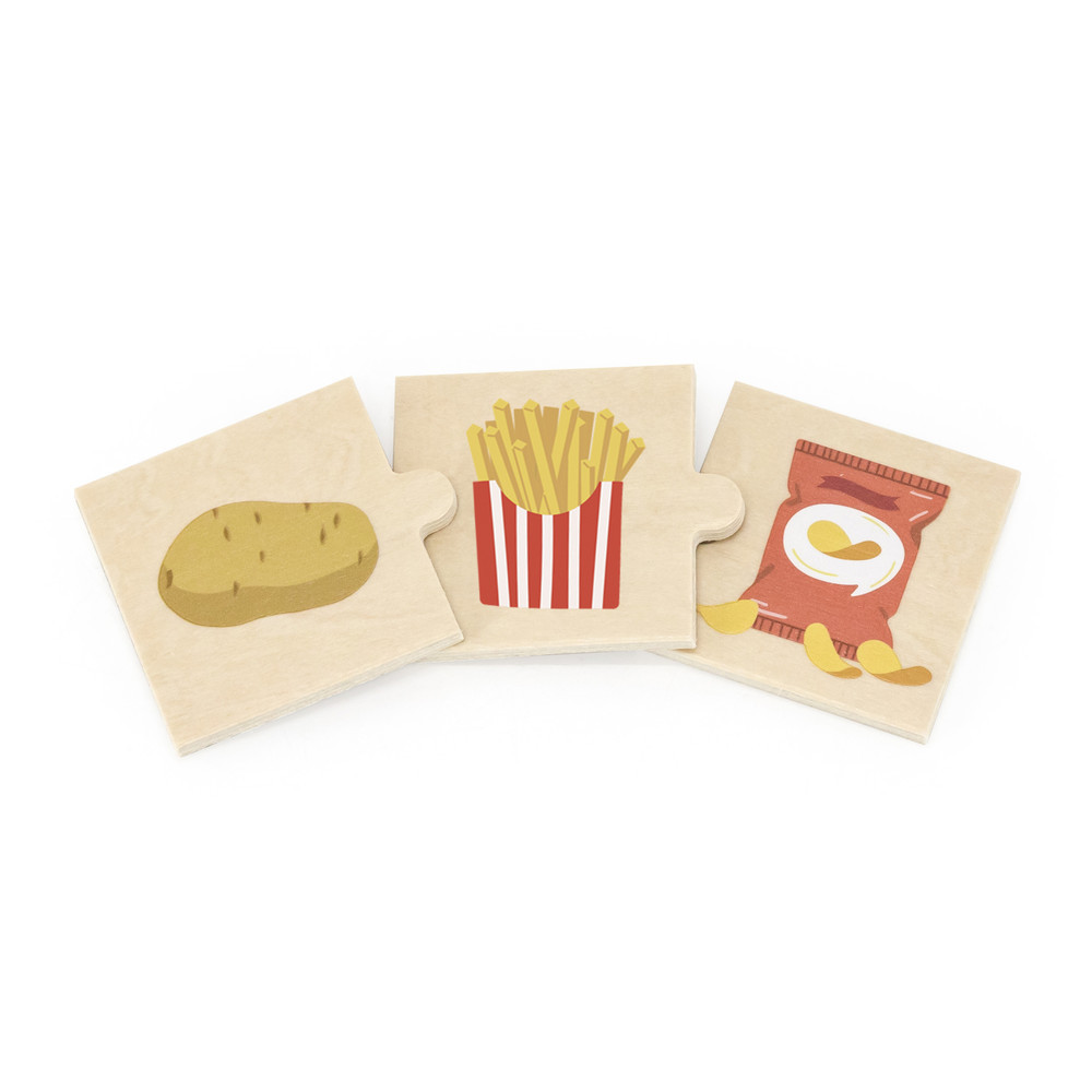 Keresd meg az alapanyagot, találd meg, mivé alakul, és rakd ki a háromelemes „életútját”! Kukoricából pattogatott kukorica vagy corn flakes? Játék közben a gyerekek megismerik, hogyan jut el az étel a farmtól az asztalig, miközben fejlődik a logikus gondolkodásuk és a finommotorikájuk.