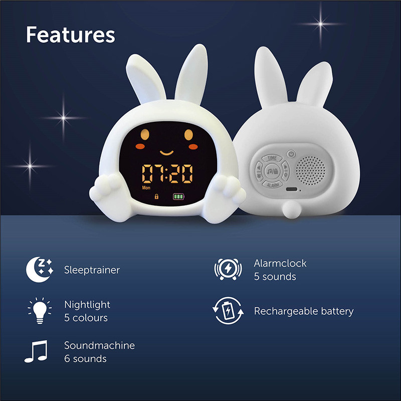 Az éjszakai fény 5 különböző színben világít, fényereje állítható, és 30 perc után automatikusan kikapcsol. A beépített hanggép 6 megnyugtató dallamot kínál, az ébresztőóra pedig 6 választható hanggal segíti a kellemes reggeli ébredést.