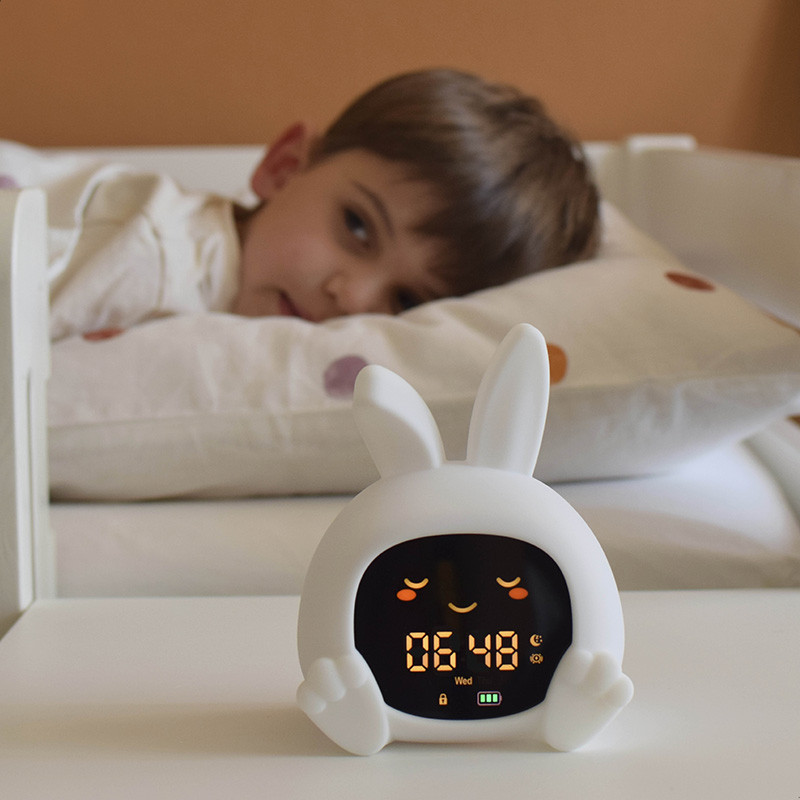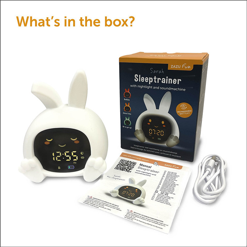 A Zazu SARAH nyuszi alvástréner egy szerethető, gyerekbarát eszköz, amely segít a kicsiknek eligazodni az alvás és ébrenlét idejében. A mozgó szemek és a színjelzések egyszerűen, szavak nélkül is érthetővé teszik, mikor kell ágyban maradni.
